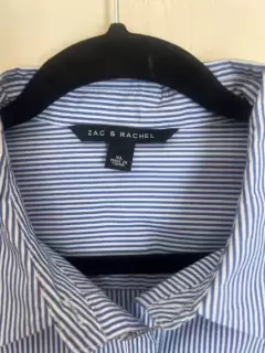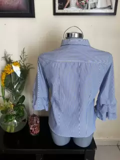 Blusa tipo camisa , con botones al frente , manga tipo globo , con raya tipo gis