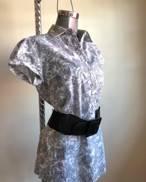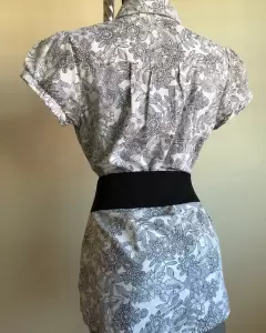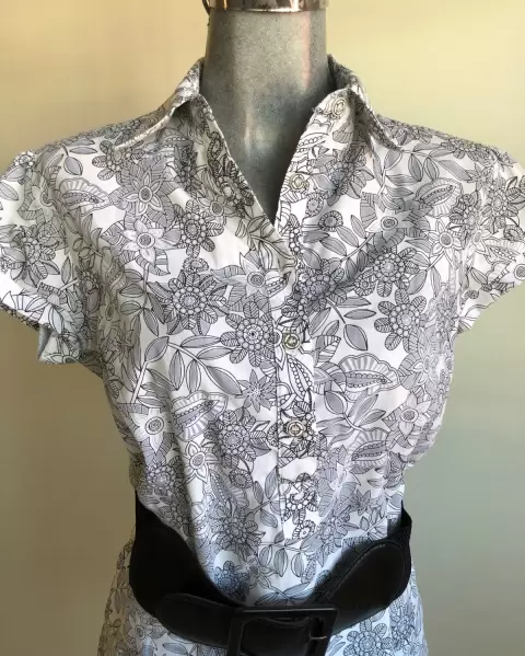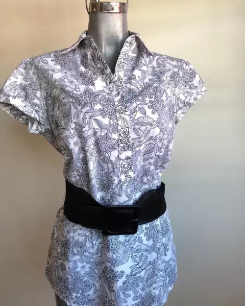 BLUSA MARCA CHOCOLATE ESTAMPADA. HERMOSA BLUSA MARCA CHOCOLATE, MANGA CORTA EN COLOR BLANCO CON DISEÑO FLORAL EN LÍNEAS COLOR NEGRO, INCLUYE CINTURÓN ANCHO, TALLA MEDIANA. ENVÍO PRENDA SANITIZADA, USO MATERIAL RECICLADO GRACIAS POR TU COMPRENSIÓN.