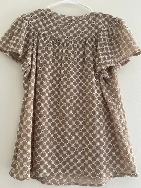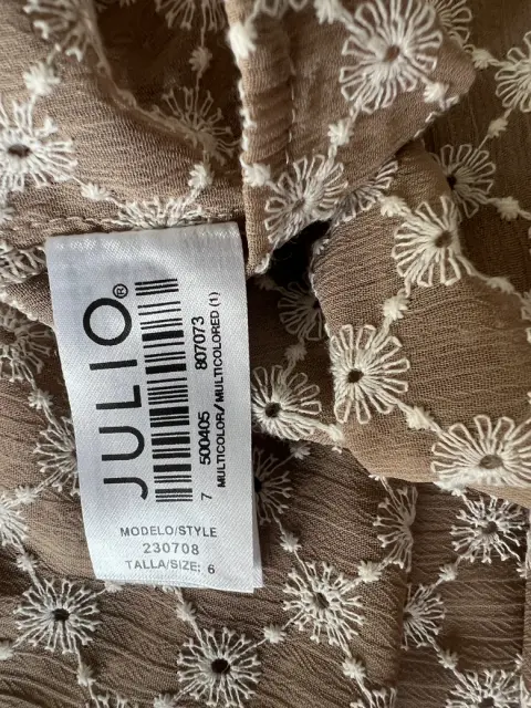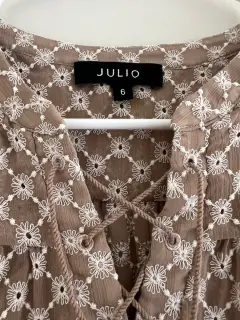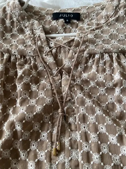 BLUSA MARCA JULIO. Blusa manga corta marca JULIOTalla 6Medida axila-axila 50cmColor café claro con bordado de detalles en blanco Tela frescaUsada en 2 o 3 ocasionesSin detalles