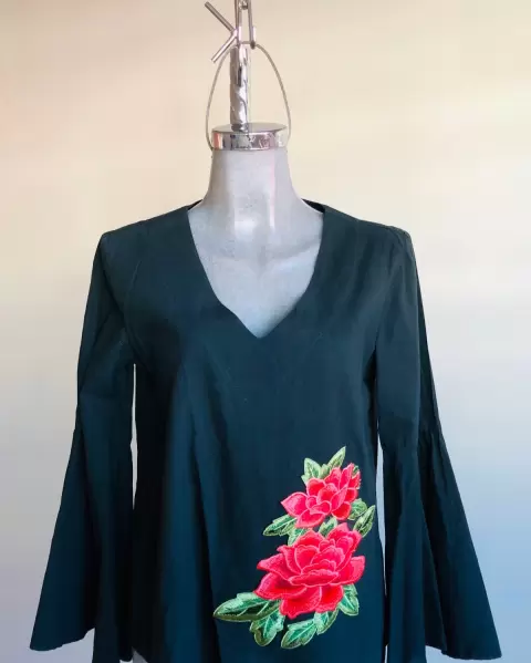 HERMOSA BLUSA MARCA LOB, EN COLOR NEGRO CON APLICACIÓN DE FLOR BORDADA EN UN COSTADO. MANGA LARGA Y ACAMPANADA. TALLA CHICA, EXCELENTE PAR TODO TIPO DE OCASIÓN. ENVÍO LA PRENDA SANITIZADA, USO MATERIAL RECICLADO GRACIAS POR TÚ COMPRENSIÓN 😊