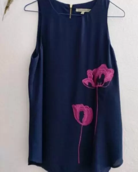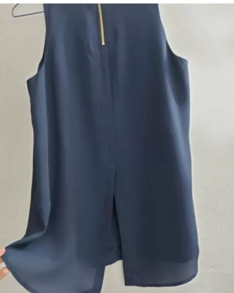 Es una blusa NUEVA preciosa, con tela de hermosa caída 100% polyester, tipo seda. Color azul marino. Talla S. Sin detalles.De axila a axila: 46 cm, hombros: 27 cm, largo: 66 cm.