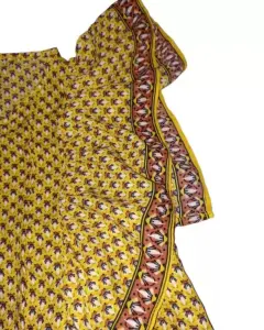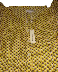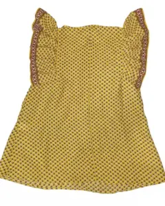 Disfruta de esta hermosa blusa 100% Poliester en tonos Amarillos con cafe tiene 4 botones al frente que puedes soltar para hacer un escote pronunciado, con medidas 45 Cm de Axila a Axila y 60 Cm de Largo