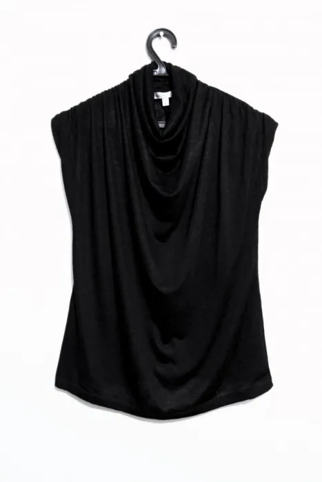 COLOR NEGRO, CUELLO ALTO DRAPEADO, STRETCH, TALLA CHICA, MEDIDAS DE UNA CARA: AXILA A AXILA 42 CM (ESTIRA HASTA LOS 55), LARGO 56 CM.