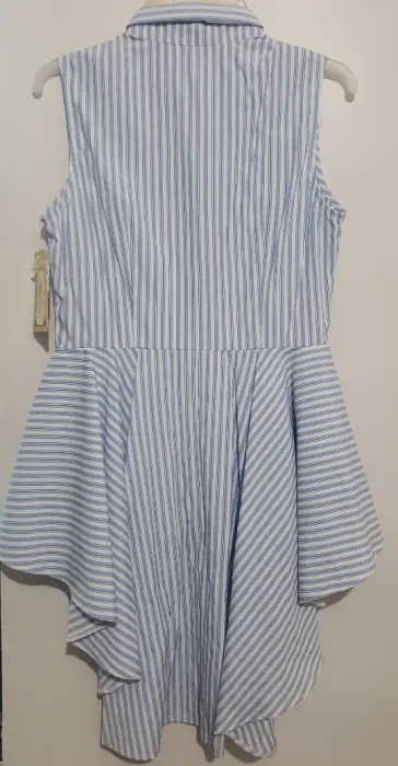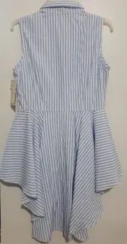 Blusa moderna. Blusa talla 6 (CH) sin manga, a rayas verticales en el torzo, con botones y cuello camisero, olan en la cintura, por la parte de enfrente rayas horizontales y en la parte de atrás es más largo y rayas verticales