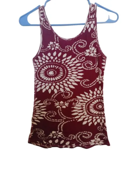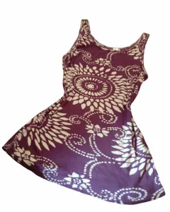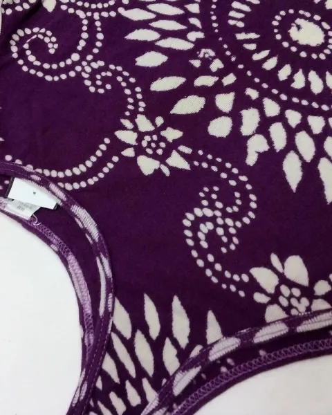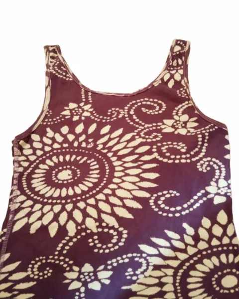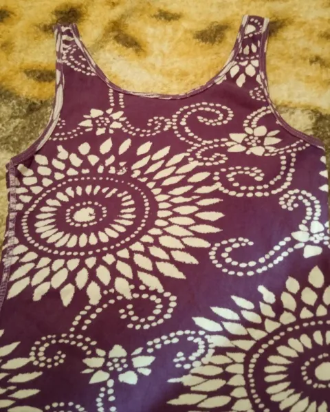 Blusa morada de resaque. Blusa de resaque strech. Estampado psicodélico. El color es entre morado y tinto, muy bonita. Tela delgada y fresca, de algodón. No viene muy amplia, queda a s y m.