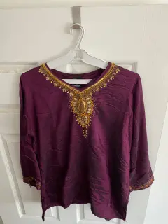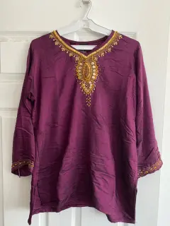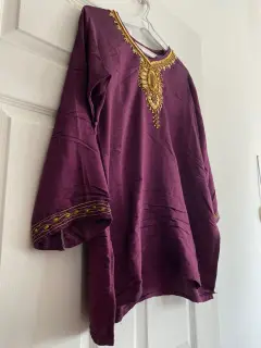 Blusa morada estilo árabe, con brillos dorados en el cuello, tela de calidad y muy cómoda y transpirable.