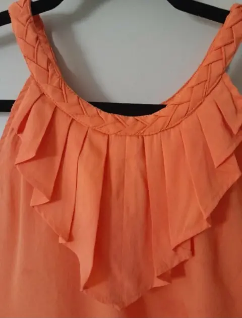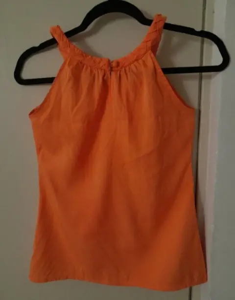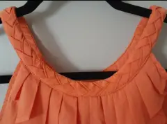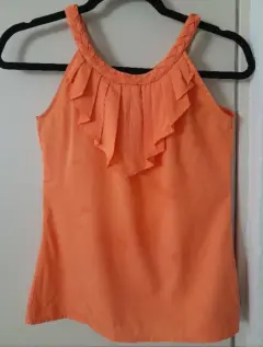 Blusa sin manga Banana Republic, color naranja, talla xxs, pero puede quedar hasta chica delgada. Mide 42 cm de axila a axila. Cuello trenzado con holán tableado en pico, súper linda y favorecedora. Cierra con botón en parte trasera del cuello
