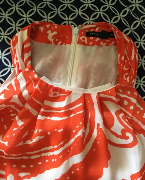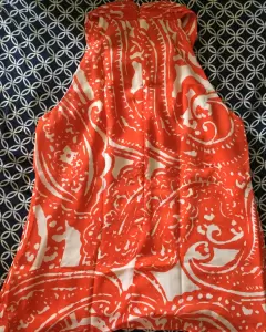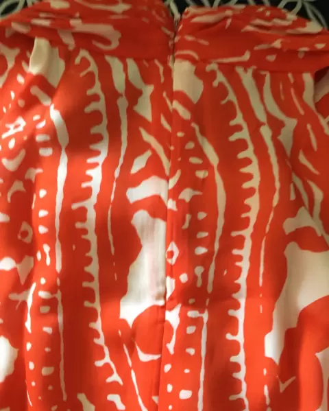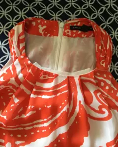 Blusa naranja resacada. Blusa con hombros escotados, cierre oculto trasero, tiene forro, estampada naranja y blanco, se ve muy elegante.