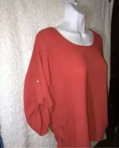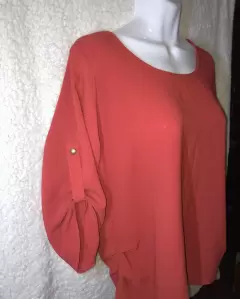 Blusa naranja suelta sin detalles de uso, marca vertíche, mangas a medio brazo se puede extender