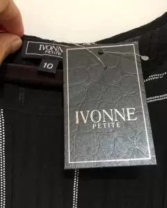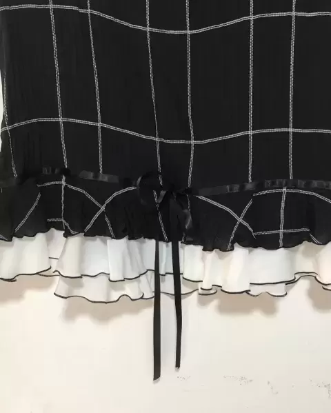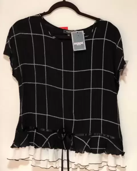 Blusa negra a cuadrosMarca IvonneTalla 10, entre M y G72% viscosa, 28% poliamidaManga hombros caidosOlanes en parte inferior