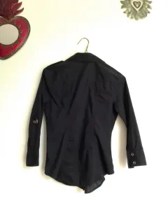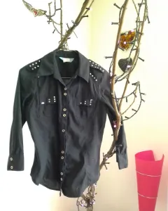Blusa Negra Aplicaciones. Blusa negra con aplicaciones en color plata en hombros y bolsas delanteras, con tiras en mangas para acortar el largo de ésta.