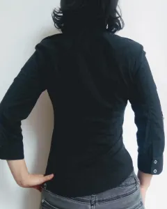 Blusa negra con aplicaciones en color plata en hombros y bolsas delanteras, con tiras en mangas para acortar el largo de ésta.