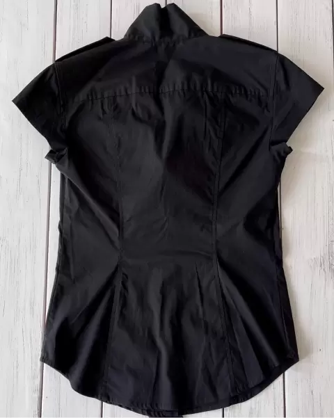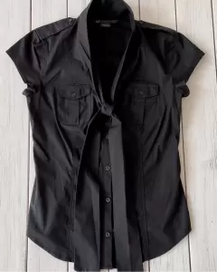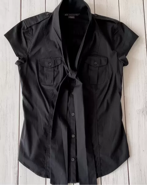 Blusa negra Armani Exchange. Blusa negra Armani ExchangeTalla: XS, manga corta, dos bolsillos al frente y ajustable al cuerpo.Medidas: 39.5 cm de axila, 36 cm de hombros, 60 cm de largo. Sin detalles.