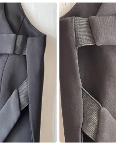 Talla: XS, blusa cuello redondo al frente, sin mangas, espalda con escote, se cierra con broches pequeños y un cierre en la parte inferior. Tiene resortes a los lados para facilitar el movimiento. Medidas: 31.5 cm de hombros, 40 cm de axila, 35 cm donde empieza el cierre (cintura) y 35 cm de largo a partir del cierre.
