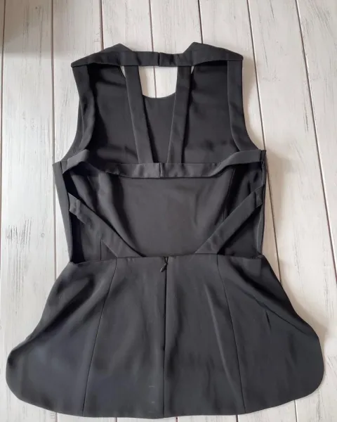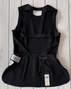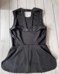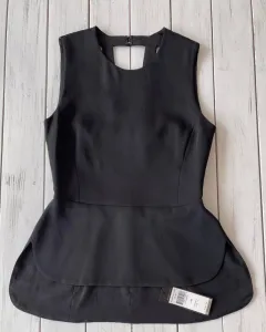 Blusa negra con escote en la espalda BCBG MAXAZRIA. Talla: XS, blusa cuello redondo al frente, sin mangas, espalda con escote, se cierra con broches pequeños y un cierre en la parte inferior. Tiene resortes a los lados para facilitar el movimiento. Medidas: 31.5 cm de hombros, 40 cm de axila, 35 cm donde empieza el cierre (cintura) y 35 cm de largo a partir del cierre.