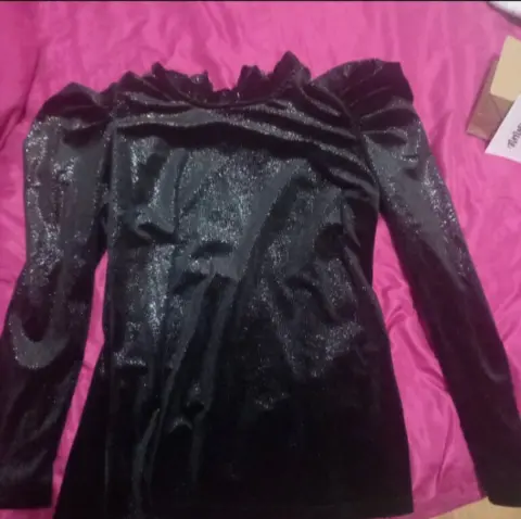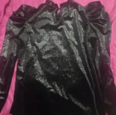 Blusa negra con plateado. Blusa manga larga con destellos plateados, manga princesa la tela es un poco caliente , en la etiqueta dice extra grande viene reducida queda perfectamente a talla Mediana