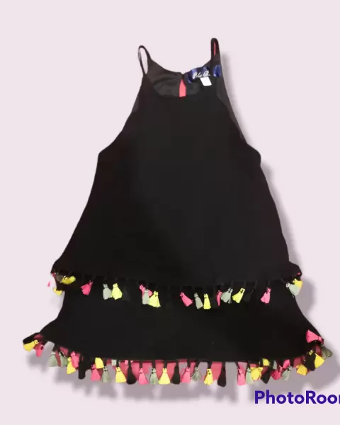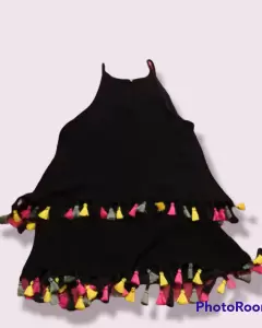 Linda blusa negra, con pompones de colores y cuello halter, super fresca y ligera, tiene un fondo ligero, por lo que no transparente. Esta en buen estado y queda a talla m.