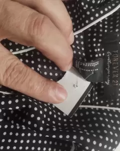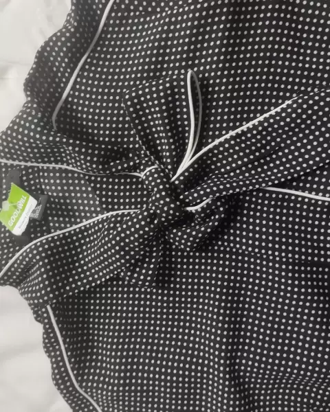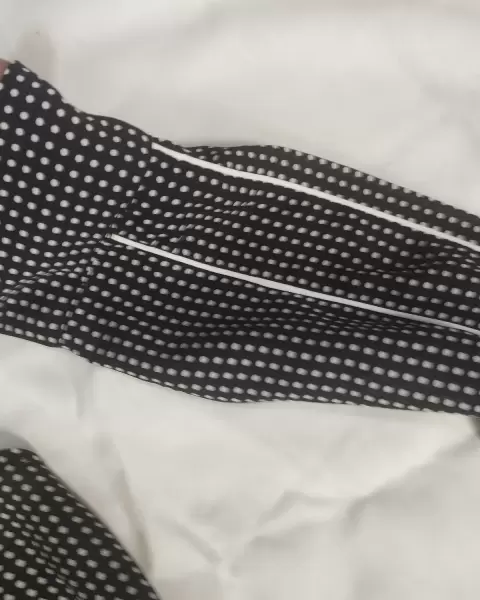 Blusa negra con puntos blancos, tela muy ligera, manga larga el cuello se hace moño
