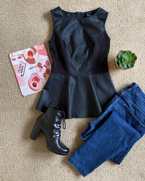 Blusa negra con vini piel. Blusa sin mangas, y detalle de vinipiel, con caída de Olán a la altura de la cintura y se abrocha con cierre en la parte de atrás