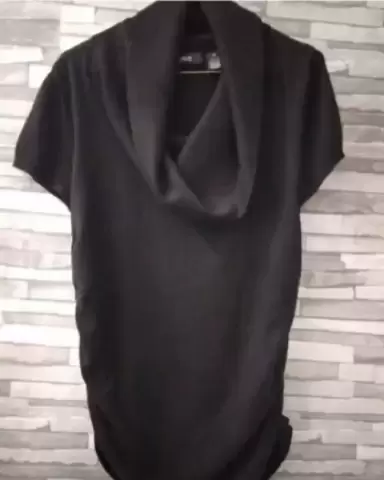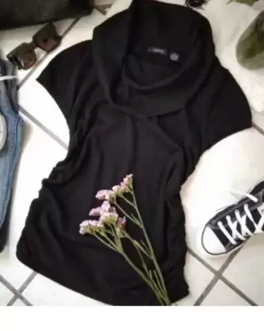 Muy linda! tono negro, de tela 73% rayón y 27% poliéster, con strech, se ajusta lindo al cuerpo y queda padrísima con Jeans, en buen estado. SIN DETALLES. Medidas:De axila a axila 45 cm, largo: 65 cm.