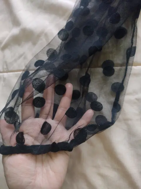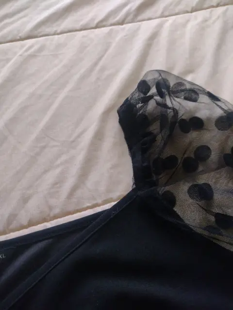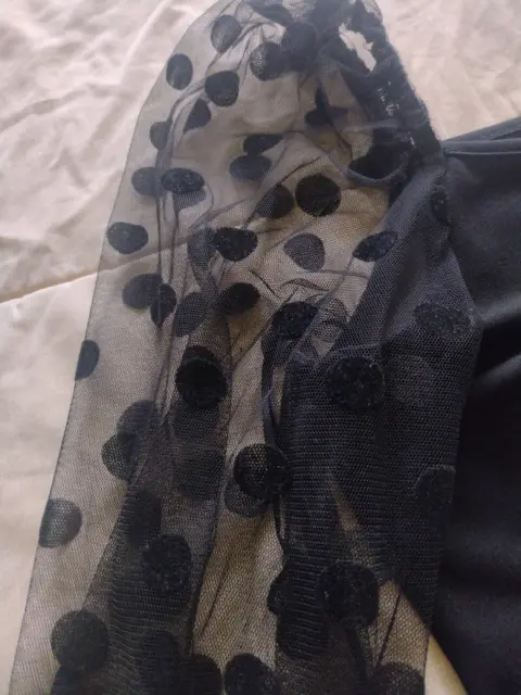 Linda blusa negra con mangas de tul y puntos negros, cuello en v, en buen estado, se usó un par de veces, es un poco corta, la tela de torso no estira y no es transparente.