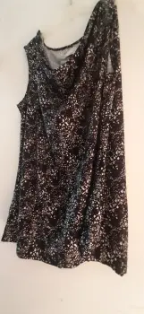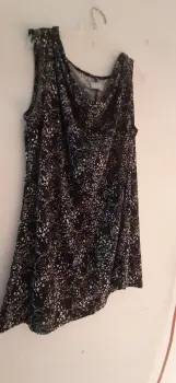 Blusa negra desmangada cuello holgado. Elástica y cuello holgado, la blusa negra con puntos blancos tipo jaspeado. Cubre bien vientre