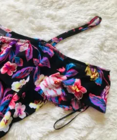 Blusa negra con flores multicolor, queda con los hombros descubiertos pero trae sus tirantes para que no se te baje. La tela es delgada y ligera tipo chiffon o gasa pero no transparenta. Ideal para este verano. La marca es americana, la prenda viene nueva con su etiqueta pero acepto ofertas razonables si es compra inmediata. paso medidas de ser necesario