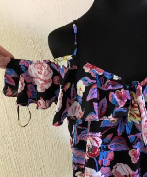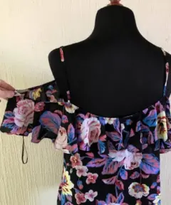 Blusa negra floral off the shoulders. Blusa negra con flores multicolor, queda con los hombros descubiertos pero trae sus tirantes para que no se te baje. La tela es delgada y ligera tipo chiffon o gasa pero no transparenta. Ideal para este verano. La marca es americana, la prenda viene nueva con su etiqueta pero acepto ofertas razonables si es compra inmediata. paso medidas de ser necesario