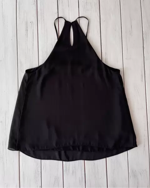 Blusa negra holgada con forro, hecha de poliéster, fresca y cómoda. Trae un mini hoyito de dónde estaba el broche de seguridad. Talla: XS Medidas 40 cm de axila y 56.5 cm de largo