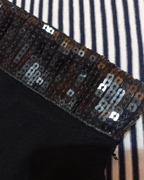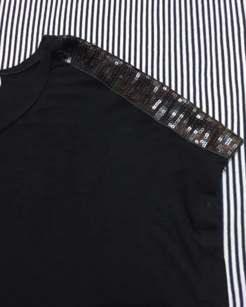 Bonita blusa de tela strech, mangas amplias tipo murciélago. Tiene aplicaciones en ambos hombros con lentejuelas negras que brillan muy bonito de noche.