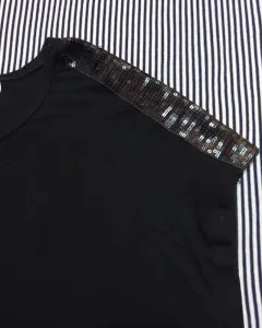 Blusa Negra Lentejuelas. Bonita blusa de tela strech, mangas amplias tipo murciélago. Tiene aplicaciones en ambos hombros con lentejuelas negras que brillan muy bonito de noche.