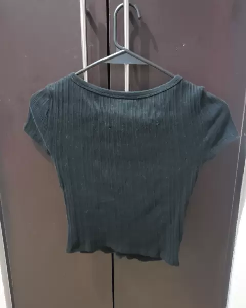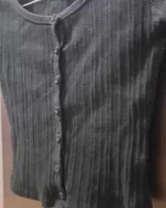 Blusa negra manga corta. Tiene botones los cuales se pueden abrir todos, la tela tiene textura, es una tela que estira bastante, es gruesa.