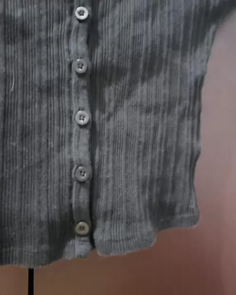 Tiene botones los cuales se pueden abrir todos, la tela tiene textura, es una tela que estira bastante, es gruesa.