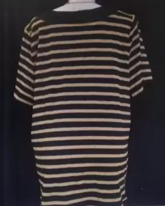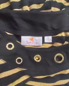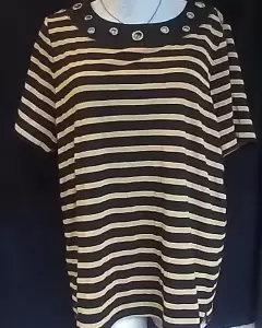 Blusa negra con rayas doradas, cuello redondo con aplicacionws de circulo con piedritas . Talla xl. Manga corta.