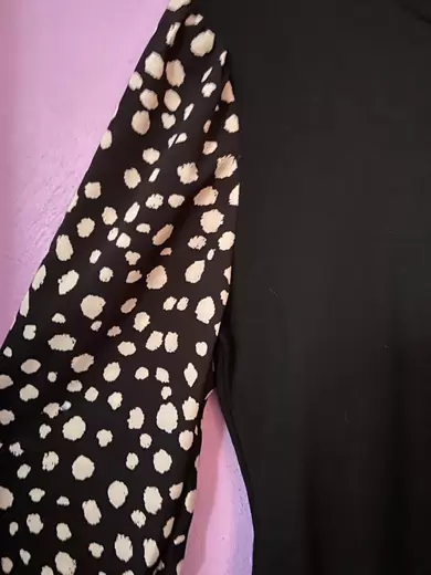 Blusa negra con cuello alto y manga larga. Es talla S, está nueva, tiene detalles en la parte de las mangas: puntos blancos y los puños terminan con una franja negra. Marca Shein