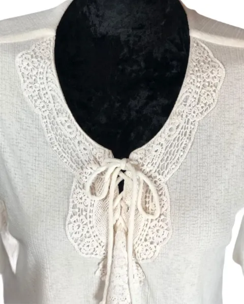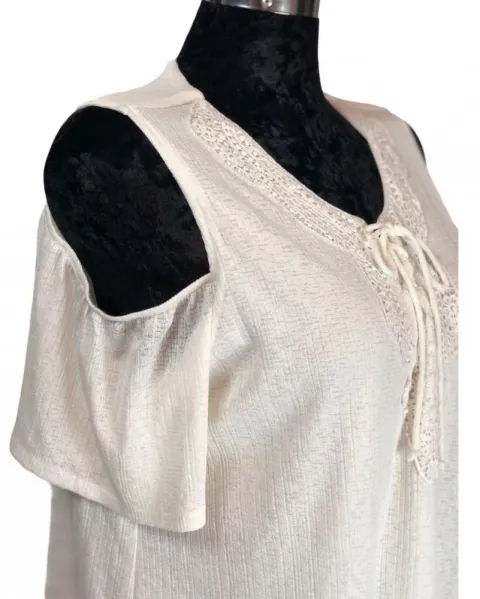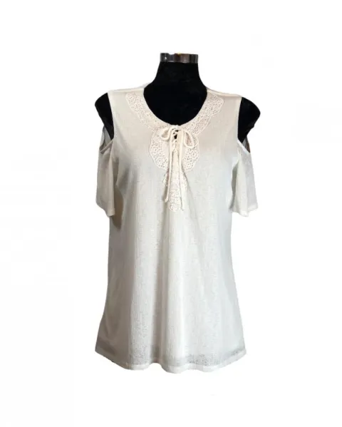 Blusa New Directions. Blusa en tela semi transparente con fondo en blanco y crochet en la parte frontal, las mangas son intermitentes en los hombros y cortas.