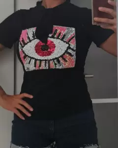 Es una blusa con estampado en tendencia de ojo turco, como para una salida de noche, casual.