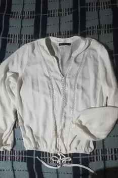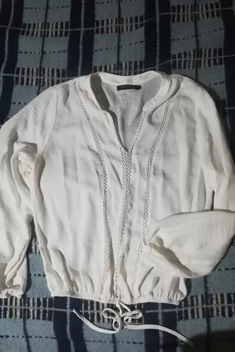 Blusa olgada color blanco sin detalles, muy fresca, manga larga. Y resorte en la parte inferior. Se ve muy linda. Talla mediana.