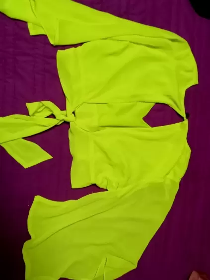 Blusa original color verde fosforescente. Blusa talla mediana, diseño de ombliguera con cintas para hacer moño, mangas con forma de corto a ancho