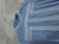 Linda blusa color azul cielo con detalles en color blanco en puños, cuello y frente. Es talla chica, muy muy cuidada.