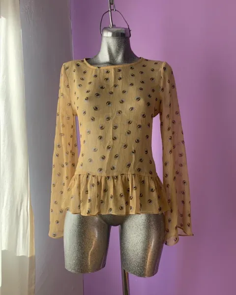 Hermosa blusita amarilla con detalles de flores, manga acampanada, tipo peplum y detalles en hilo metálico. Le va bien a una talla chica-mediana.Sus medidas son: 55cm de largo, 47cm de axila axila, 37cm de hombro a hombro y 60cm de manga.
