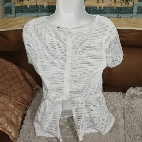 Bonita blusa tipo pepplum color blanca, tela tipo malla, estira, cuenta con botones en la parte trasera, súper fresca, ideal para usar con una blusa de tirantes abajo, enmarca muy bonito la figura.Marcada como talla M-G