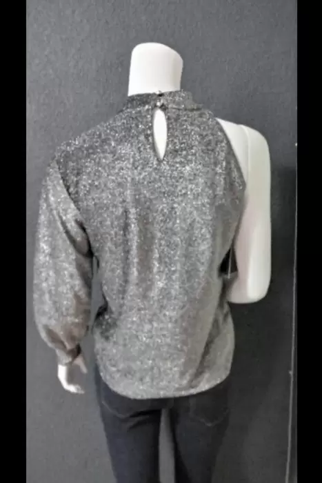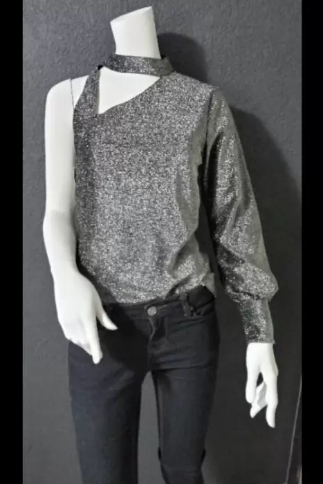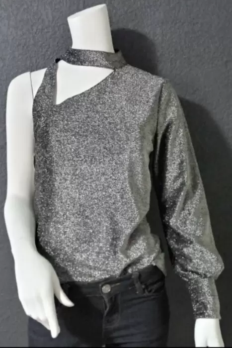 Blusa plata ALEXIS. Blusa jaspeada, colo plata, tela Ajustable, Halter, de una Sola manga larga, el corte viene amplio da perfecto a una talla Mediana.