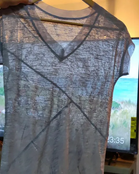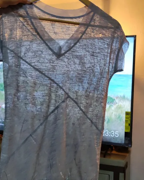 Blusa plata transparente. Queda muy linda con un top o bra Es larga para usar com leggins o jeansTela strechPuede quedar a talla Ch y MSe ven muy linda puestaMedidas 56 cm espalda alta Cintura 86cmLargo 76 cmTiene dos lijeros detalles, como ragado que no se notan, se ven en fotos 5 y 6