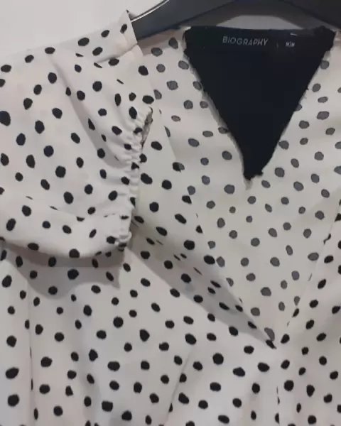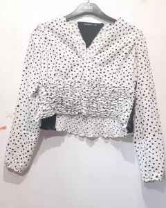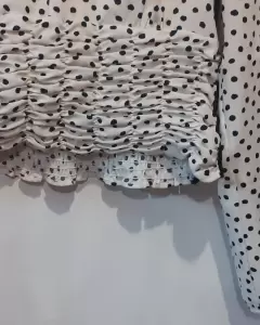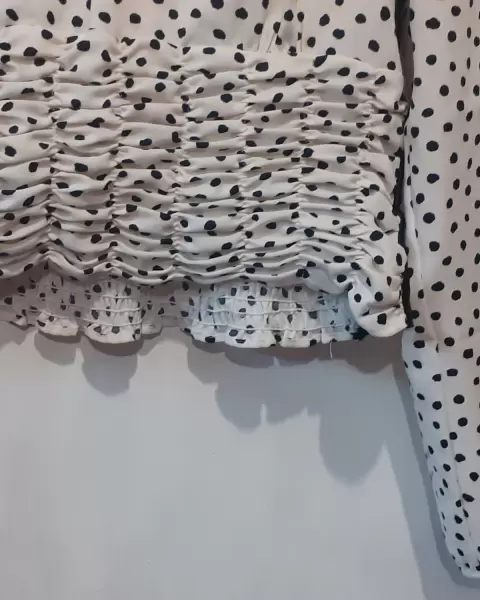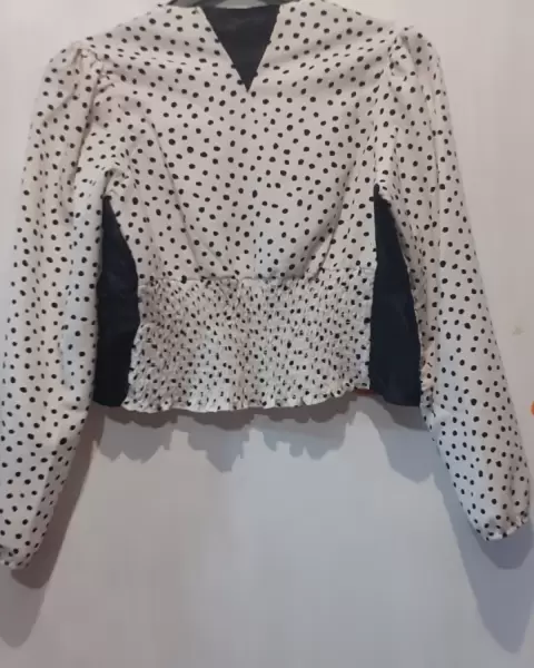 Blusa puntos pokadot. Corta, manga larga con resorte sin uso quedo justa . Recomiendo a S y M. Da de si la tela en parte de cintura, favorece silueta