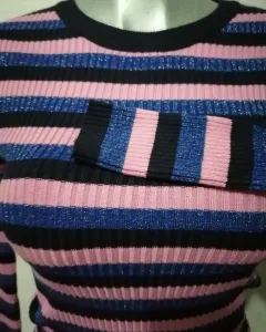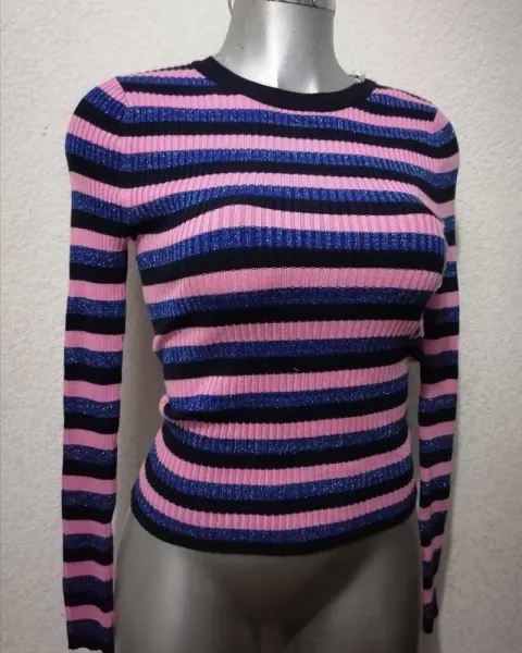 Blusa rayada rosa con azul. Hermosa blusa rosa fucsia, jaspeada, con resorte ancho que amolda mejor a la cintura, con gorro. Medidas largo 51cm, axila a axila 40cm, largo Manga 60cm, hombro a hombro 34cm
