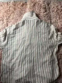 Es talla M , mide 48 cm de largo 49de ancho es rayada en color es como blanco /beige y rayas café clarito , la tela e tipo lino