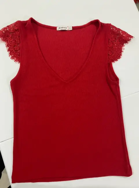 Blusa roja con encaje en las mangas. Blusa roja cuello V con poco de strech y detalle de encaje en las mangas marca stradivarius, talla M.
