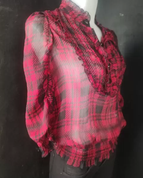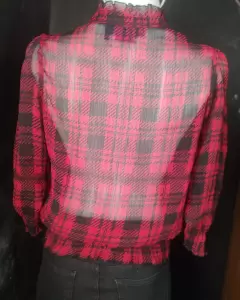 Blusa roja con negro.. transparente.. diseño a cuadros..Manga 3/4 y resorte en mangas y cintura Con olanes en la parte delantera ... Ligera..