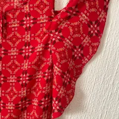 Descripción:Blusa marca Max Studio.NUEVA sin etiqueta.Color rojo con estampado en colores negro, amarillo y blanco.Mangas de hombros descubiertos con volantes amplios.Tels súper cómoda y fresca.Talla chica.